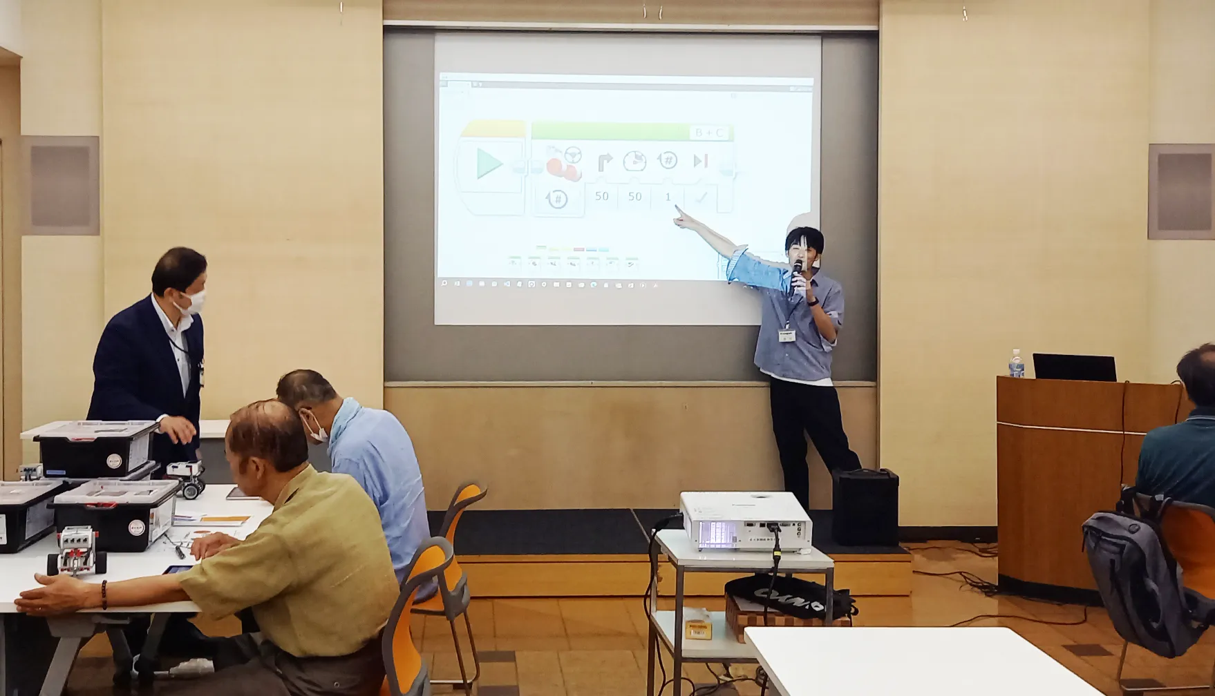応募者多数のため当初の予定を変更して、午前の部と午後の部で2回入れ替え制となりました。大人向けロボットプログラミングイベントは希少とのことで、たくさんのご応募をいただき、ありがとうございました。 「孫が小学校でプログラミングを学んでいるので興味を持った」「プログラミングを通して論理的な考えを身に着けたい」など応募動機も様々で、女性参加者の割合が多いのも印象的でした。