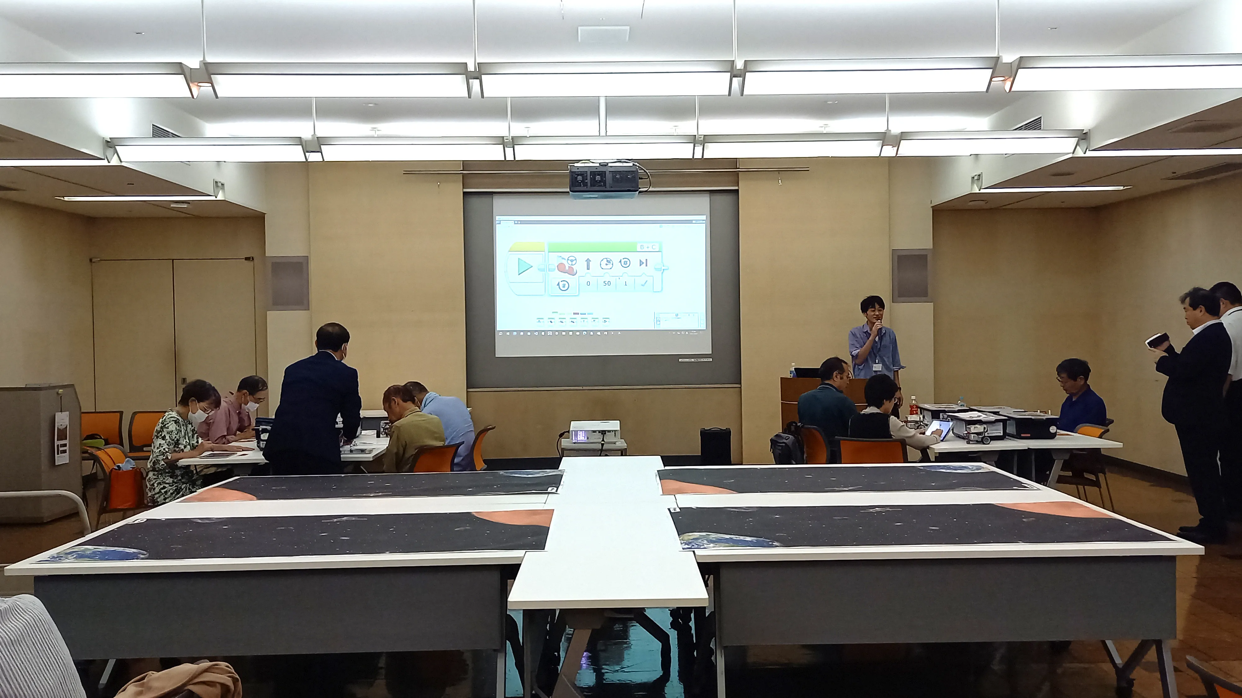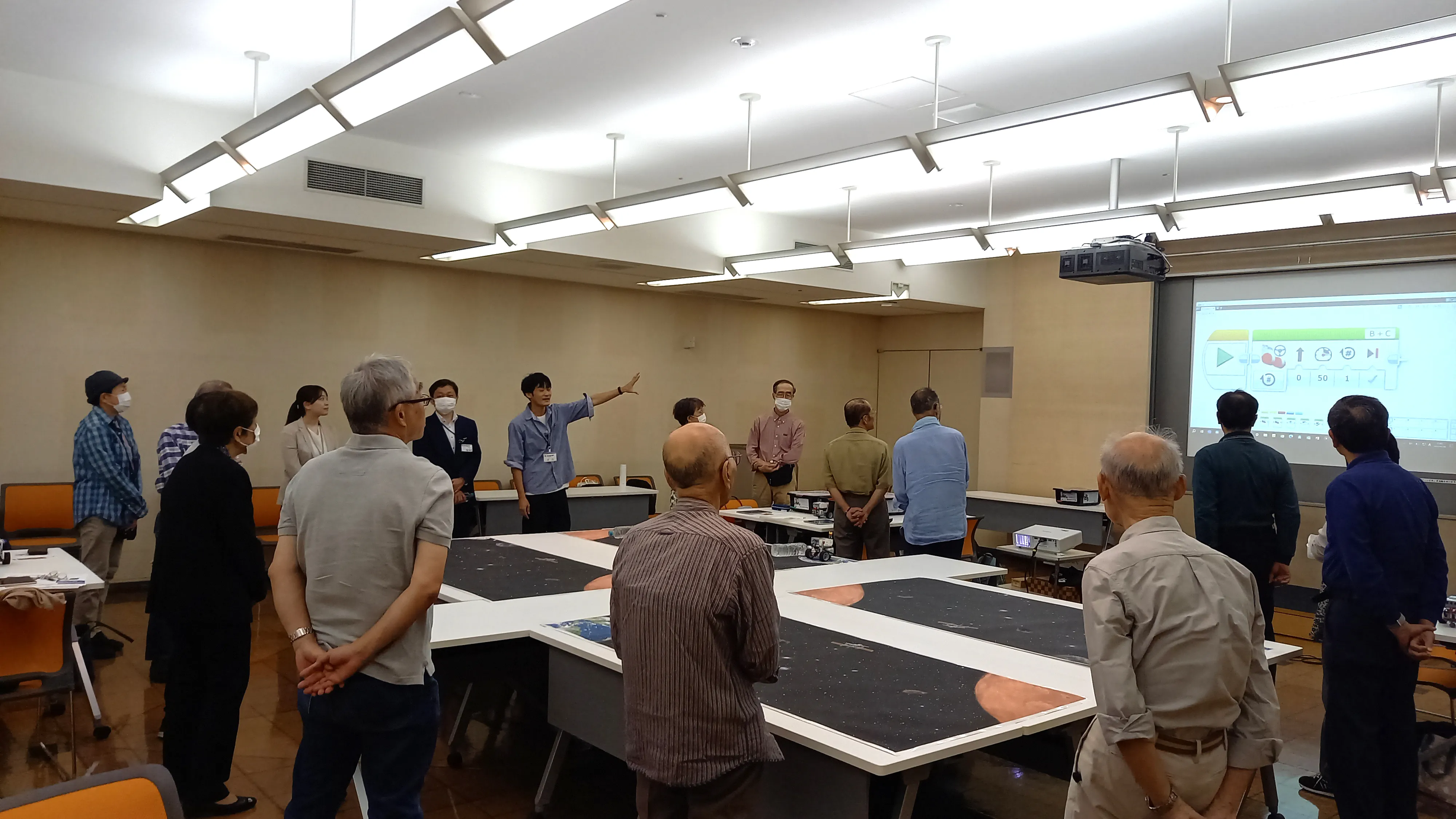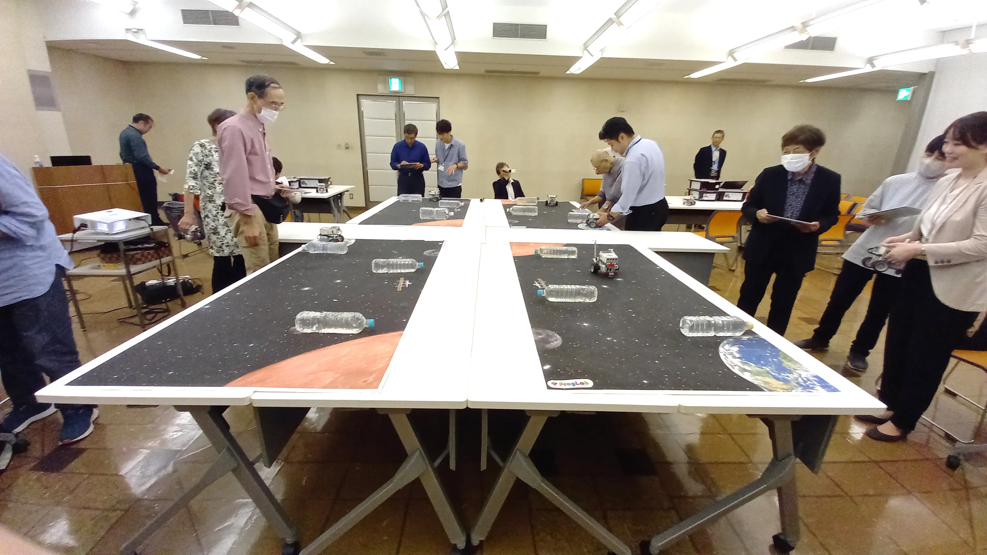 皆様自由にプログラミングされていて、動作も個性が出ていました。 一番初めにプログラムを完成されたのは80代男性参加者で、「地球を出発して、火星に到着する」というミッションだけでなく、往復して「火星から地球に戻ってくる」動作も短時間で習得されていました。